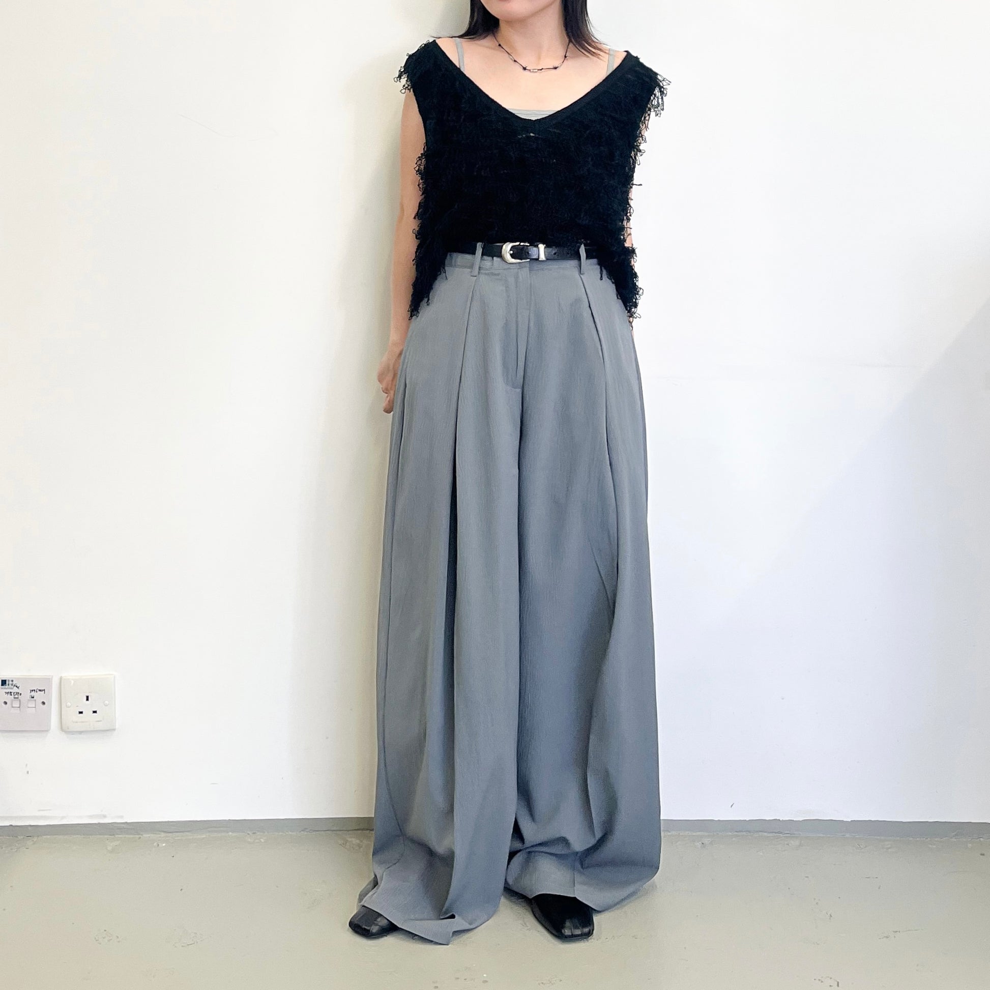 PT97- Long Pleated Wide Pants | Grey